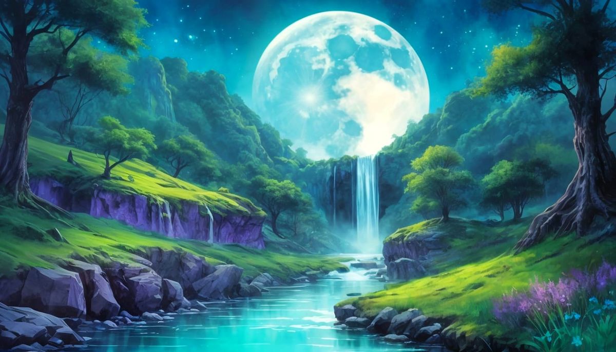 A striking picture of a moonlit fantasy landscape featuring rivers and waterfalls. The image is rendered in watercolor and ink, with turquoise and purple hues, enhanced by volumetric lighting.