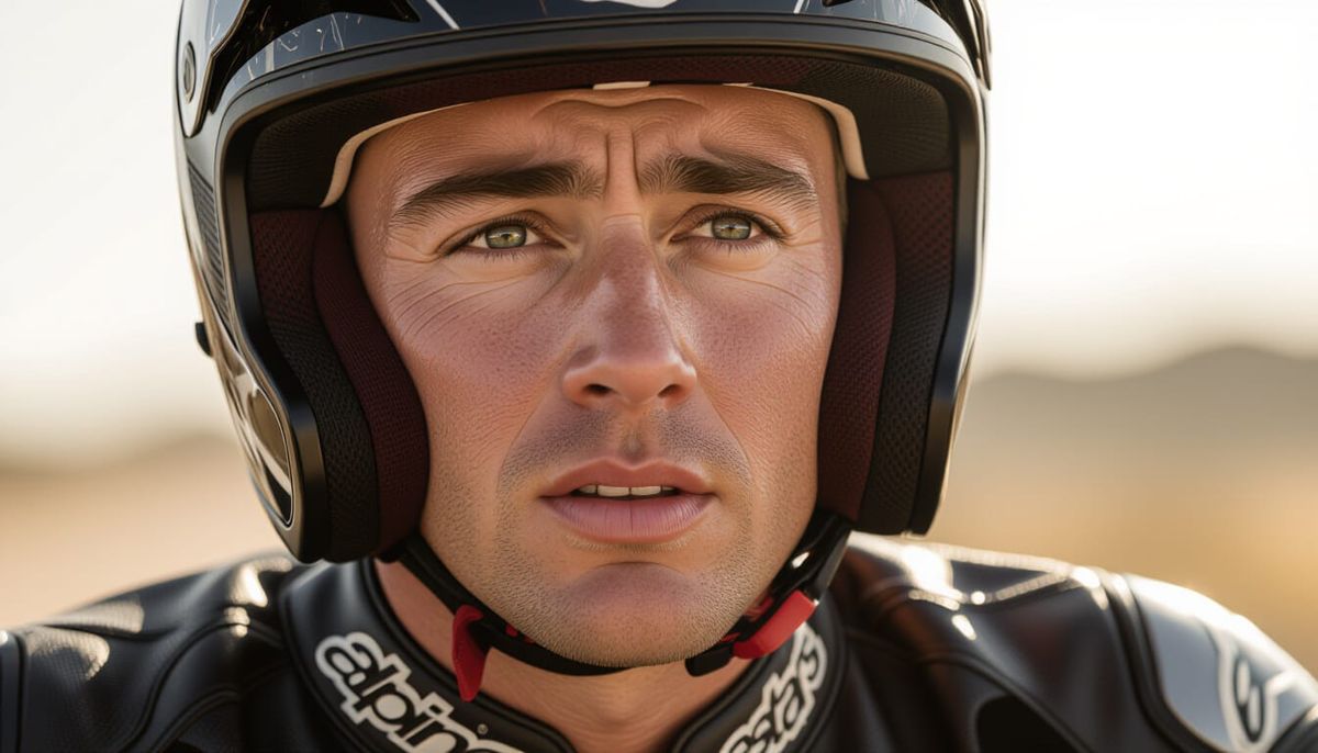 This image captures a close-up of a racer's face, helmet off, with sweat reflecting light. The racing suit is partially unzipped, conveying a sense of raw emotion and relief. Cinematic lighting enhances the scene.