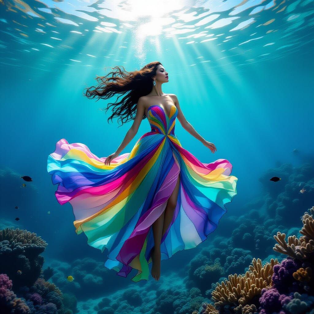 A hyperrealistic depiction of a woman with dark hair gracefully floating in a vibrant coral reef, wearing a colorful, flowing dress. The scene emphasizes light and shadow with intricate details.