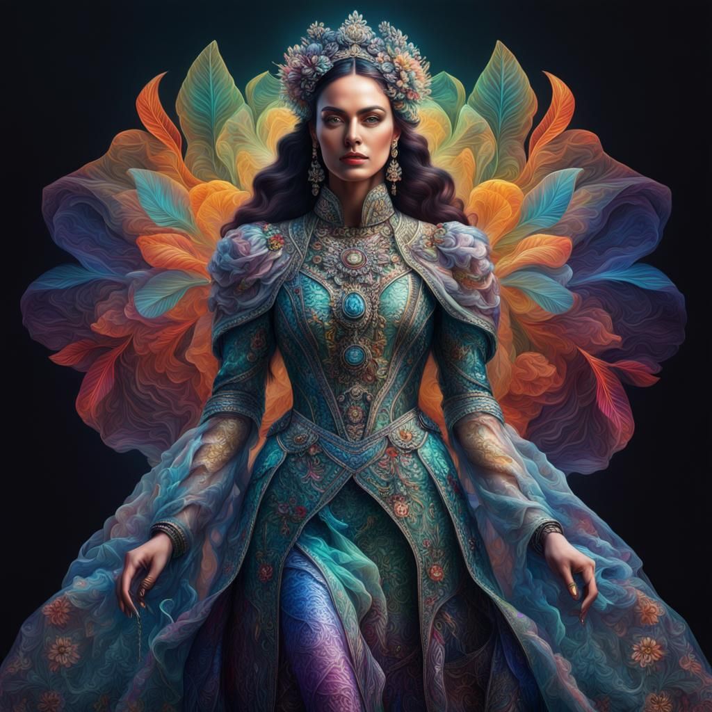 This image shows a hyperrealistic full body portrait of a woman. She wears detailed, colorful, translucent clothing in a dramatic, cinematic digital matte painting with maximalist elements.