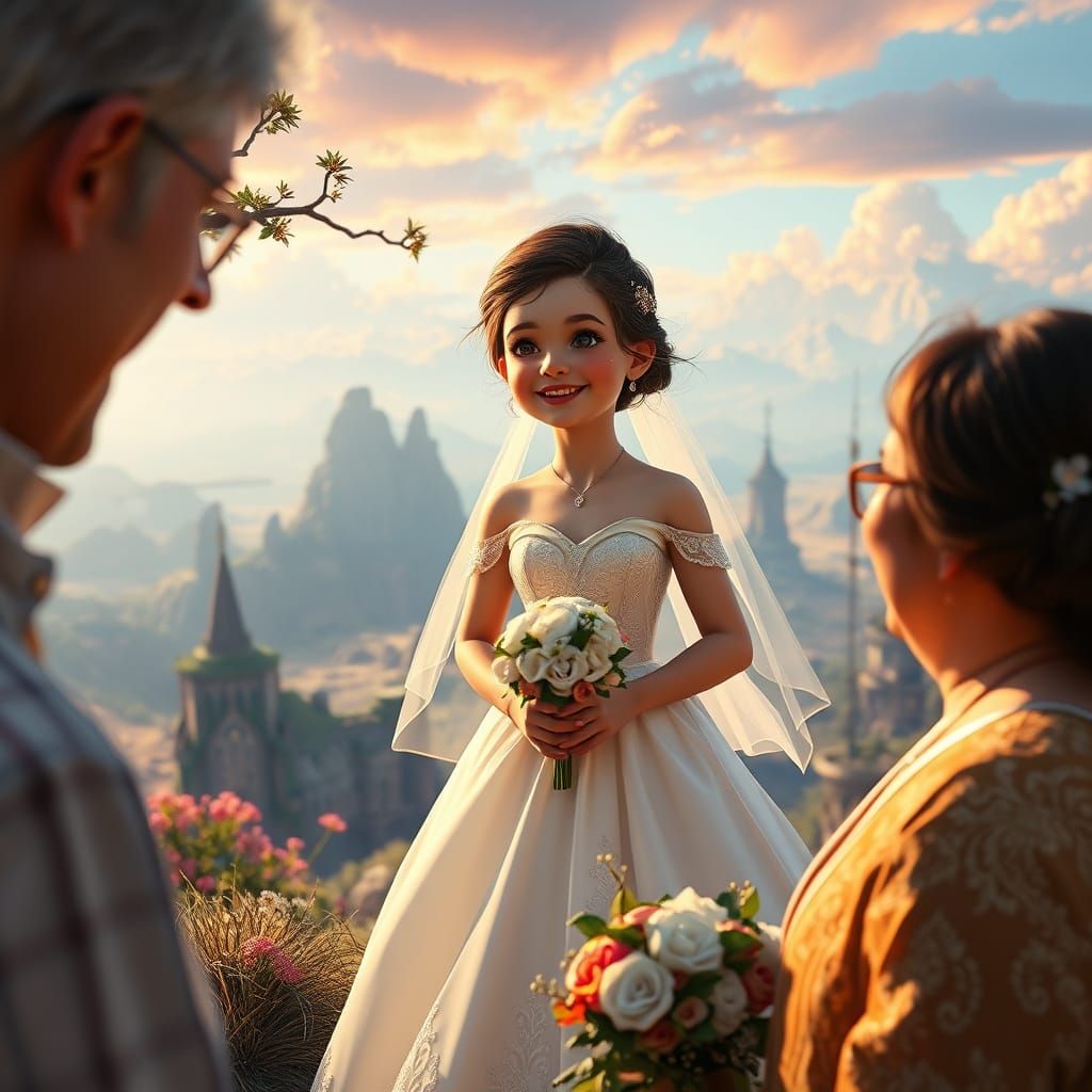 This image shows a happy bride with her parents in an amazing, detailed fantasy landscape. The artwork features deep colors and intricate details, created in a matte painting style with high visual fidelity.