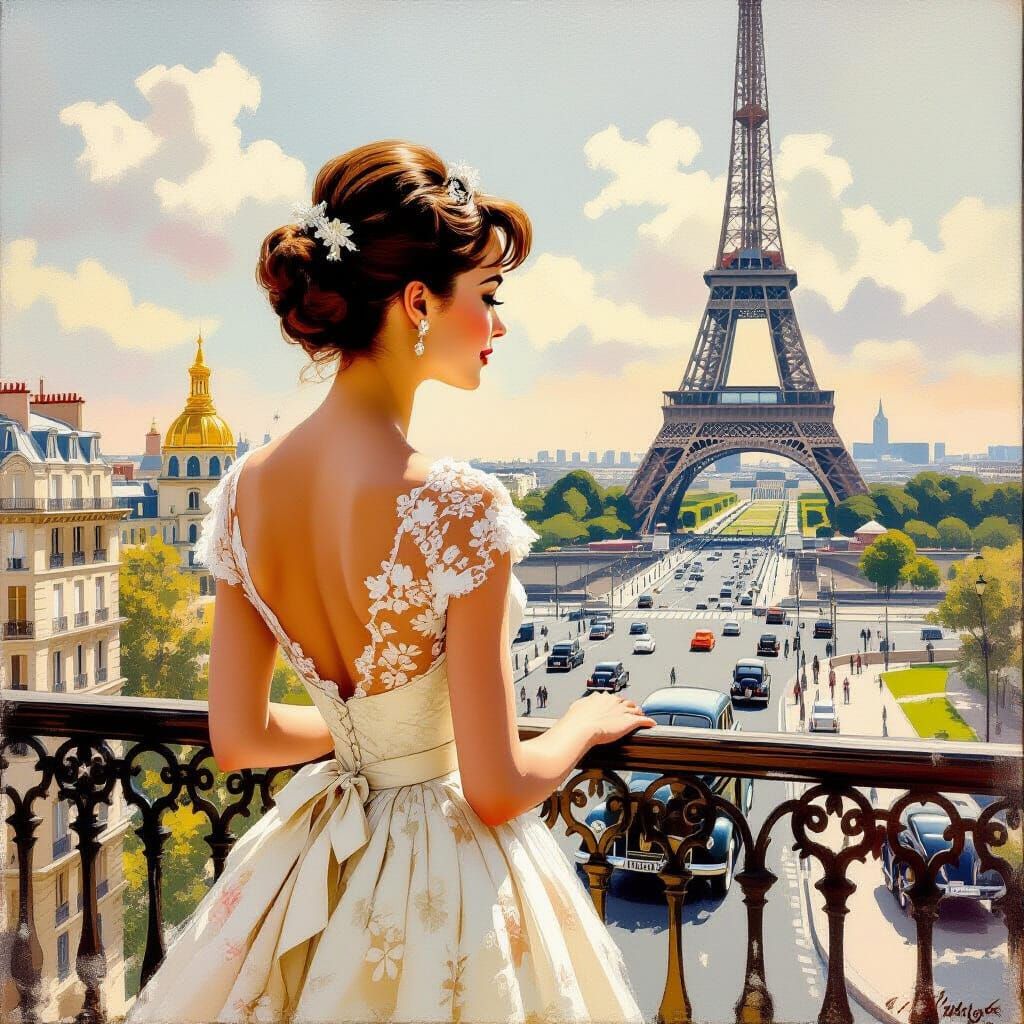 This image shows Audrey Hepburn on a Parisian balcony with the Eiffel Tower visible in the distance. She is wearing a white lace dress. The image is reminiscent of nostalgic oil paintings with soft colors.
