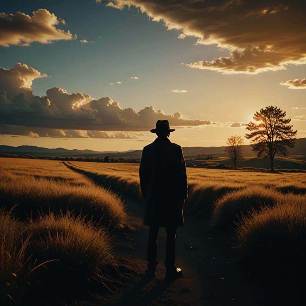 This image shows a person standing in a landscape, captured in a film noir style. The shot features high contrast shadows, warm golden lighting, and a soft focus background under a dramatic sky.