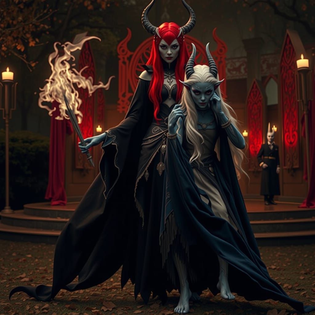 This image portrays a striking, blue-skinned elven woman, divided into a benevolent and malevolent persona. The hyperrealistic depiction, set against a poignant backdrop, evokes a cinematic aesthetic.