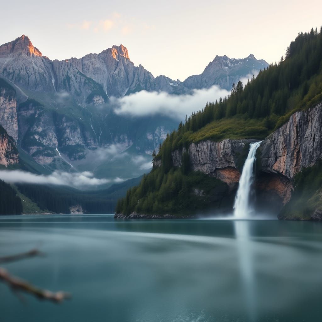 A breathtaking view of an alpine lake at sunrise. Mist shrouds a waterfall cascading down the cliffs. Soft golden light illuminates the hyper-realistic landscape in a shallow depth of field.