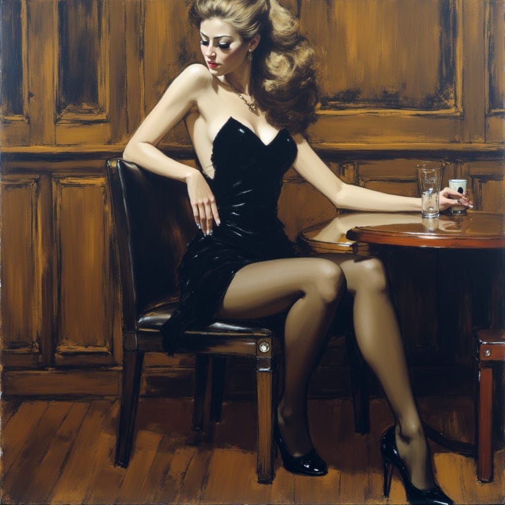 This image shows a striking abstract painting of a woman in a little black dress, high heels, and dark tights, posing in a wood-paneled lounge. The art style is brutalist.