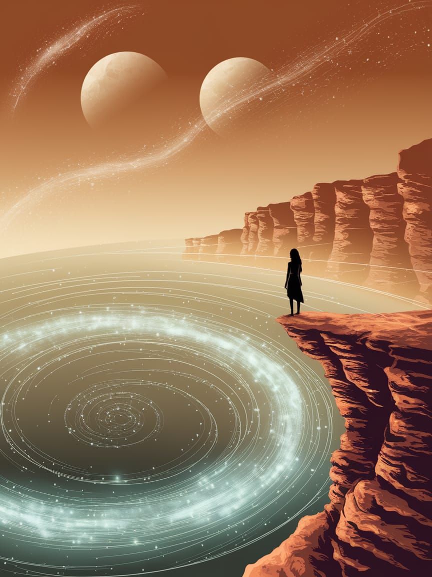 This image captures a solitary woman on an ochre cliff, overlooking a glowing alien ocean. The scene features two moons and nebulae, rendered in a soft, impressionistic style with warm amber hues.