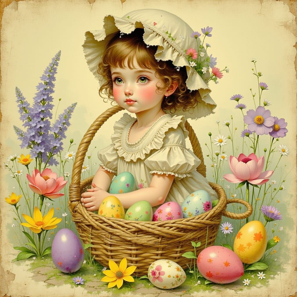 This charming image features a young girl surrounded by vibrant spring flowers, cradling a large Easter egg basket in a bright floral dress and pastel-colored bonnet, with intricate details and a soft, watercolor-inspired style reminiscent of Beatrix Potter's whimsical illustrations.