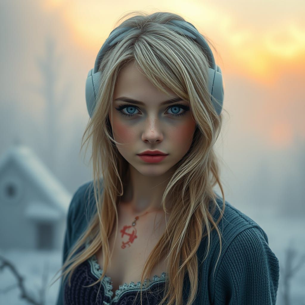 This enchanting image depicts a young woman with piercing blue eyes and ash-blonde hair, set amidst a mist-shrouded Siberian landscape, blending elements of Thomas Kinkade's whimsy, Zdzisław Beksiński's surrealism, and Simon Stalenhag's vibrant digital art, evoking an unsettling, mystifying beauty.