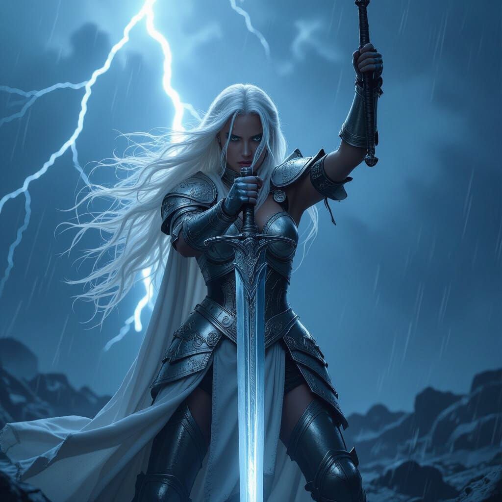 This image shows a female warrior with long white hair, in silver armor, standing in a storm. She holds a sword, her face lit by lightning, in a cinematic style.