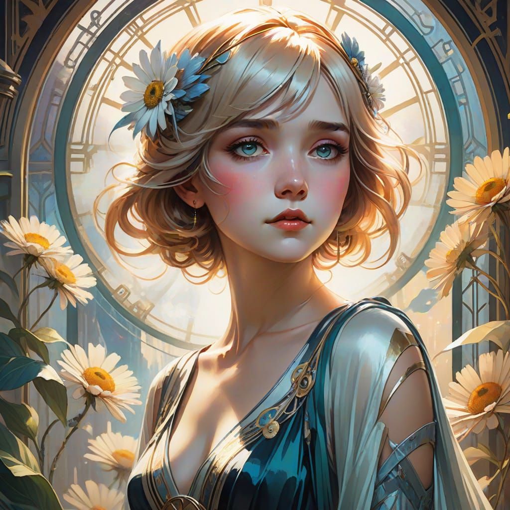 This enchanting watercolor portrait features a melancholic anime woman with a flowing gown, her eyes telling a thousand stories. A blend of vintage and futuristic elements creates a captivating scene with soft, ethereal light and vibrant colors.