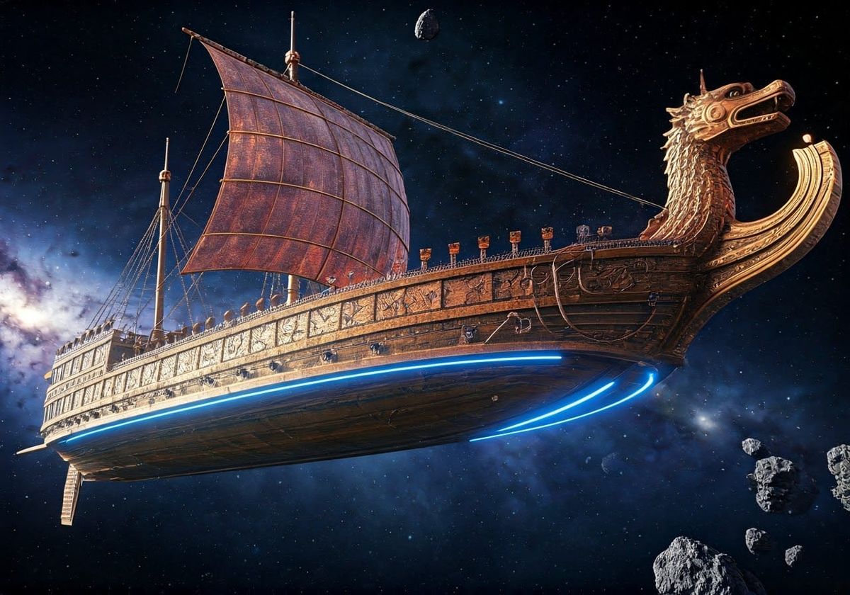 This image shows a sleek, futuristic space ship with a curved hull of bronze and cosmic alloy, featuring glowing plasma sails and laser cannons. The ship floats through deep space amidst stars, nebula clouds, and asteroid ruins, with pulsing Phoenician symbols and a trail of blue ion light.