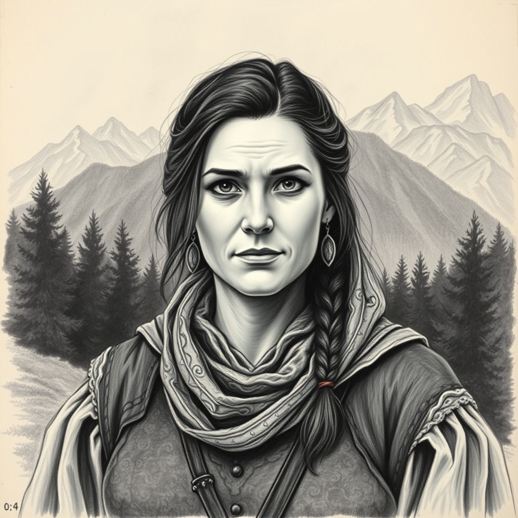 This image shows a strong, ordinary woman in her late thirties, possibly of Eastern European descent, from a fantasy medieval village. A charcoal drawing shows her against a backdrop of forest and mountains.