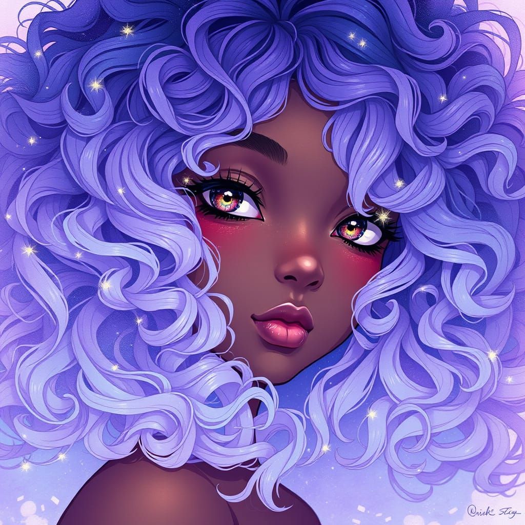This image showcases a dark-skinned anime girl with curly, ombre hair in soft lavender and blue tones, evoking a serene sunset atmosphere. Her locks feature subtle sparkling highlights, reminiscent of fireflies on a summer evening.