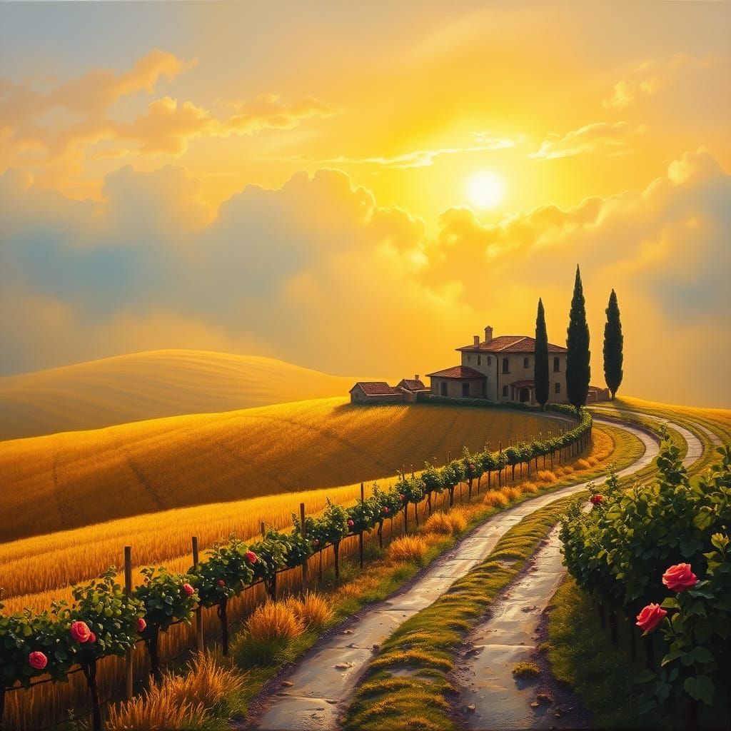 This image depicts a serene Italian countryside scene at dusk, with a rustic farmhouse and rolling vineyards bathed in warm golden light. Earthy colors and bold brushstrokes evoke the essence of a James Gurney-inspired oil painting.