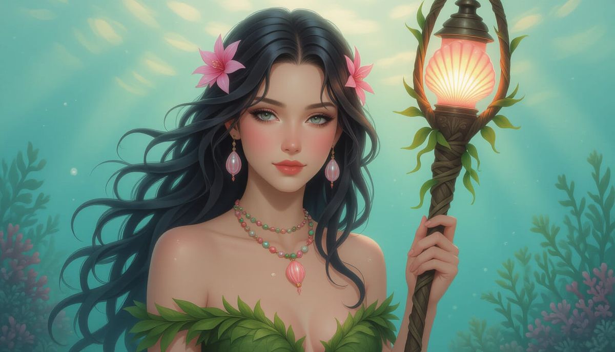 A hyperdetailed portrait of a Sandbar Siren with wet dark hair and a soft expression. She wears seaweed and coral adornments, holding a staff with a shell lantern, in sea greens and faded pinks.