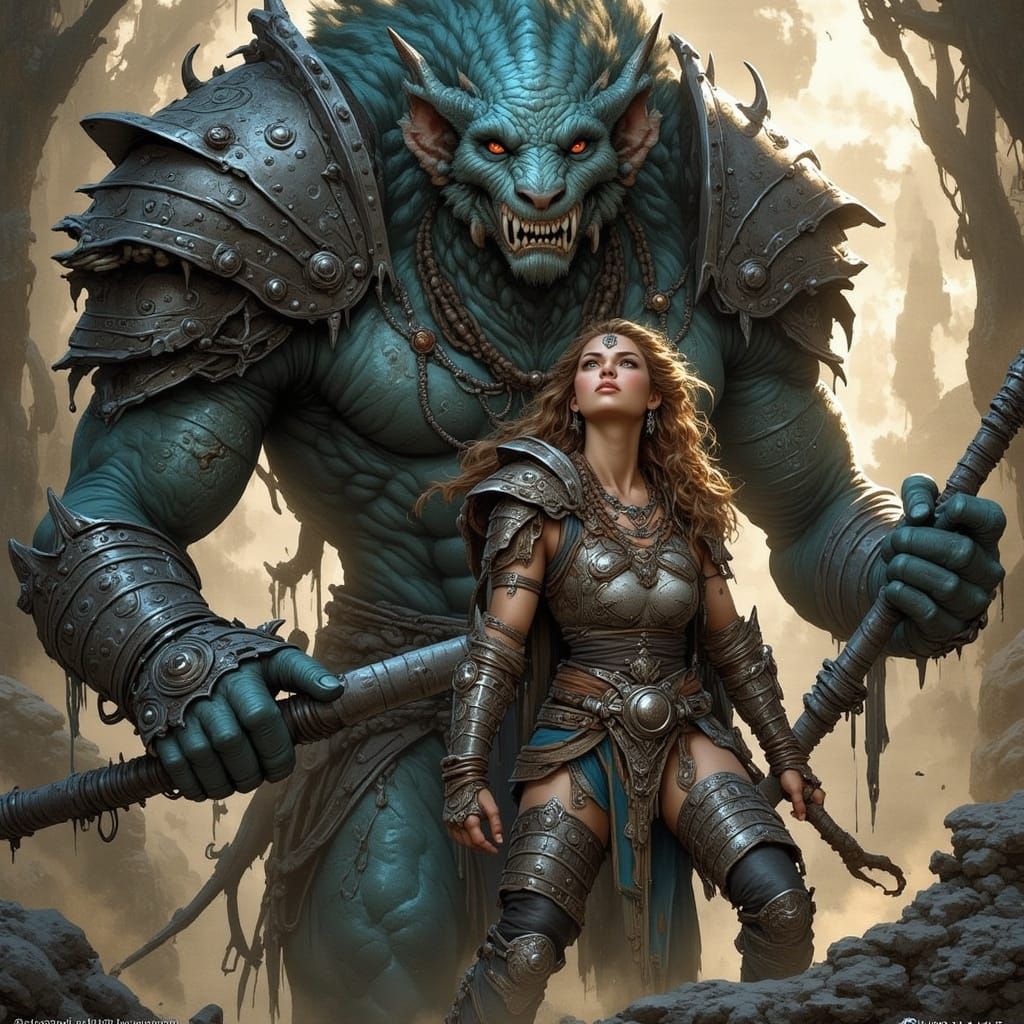 This image shows a female warrior ruling with a large creature, depicted in the style of fantasy art. The artwork evokes a dark and powerful aesthetic.