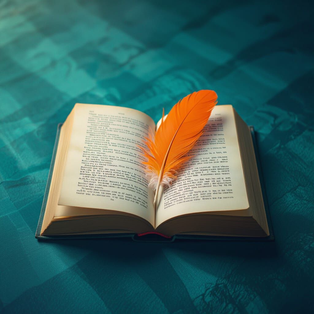 This image shows an open book with a vibrant orange feather on its pages, set against a turquoise gradient. Cinematic lighting and film grain add to the atmospheric quality.