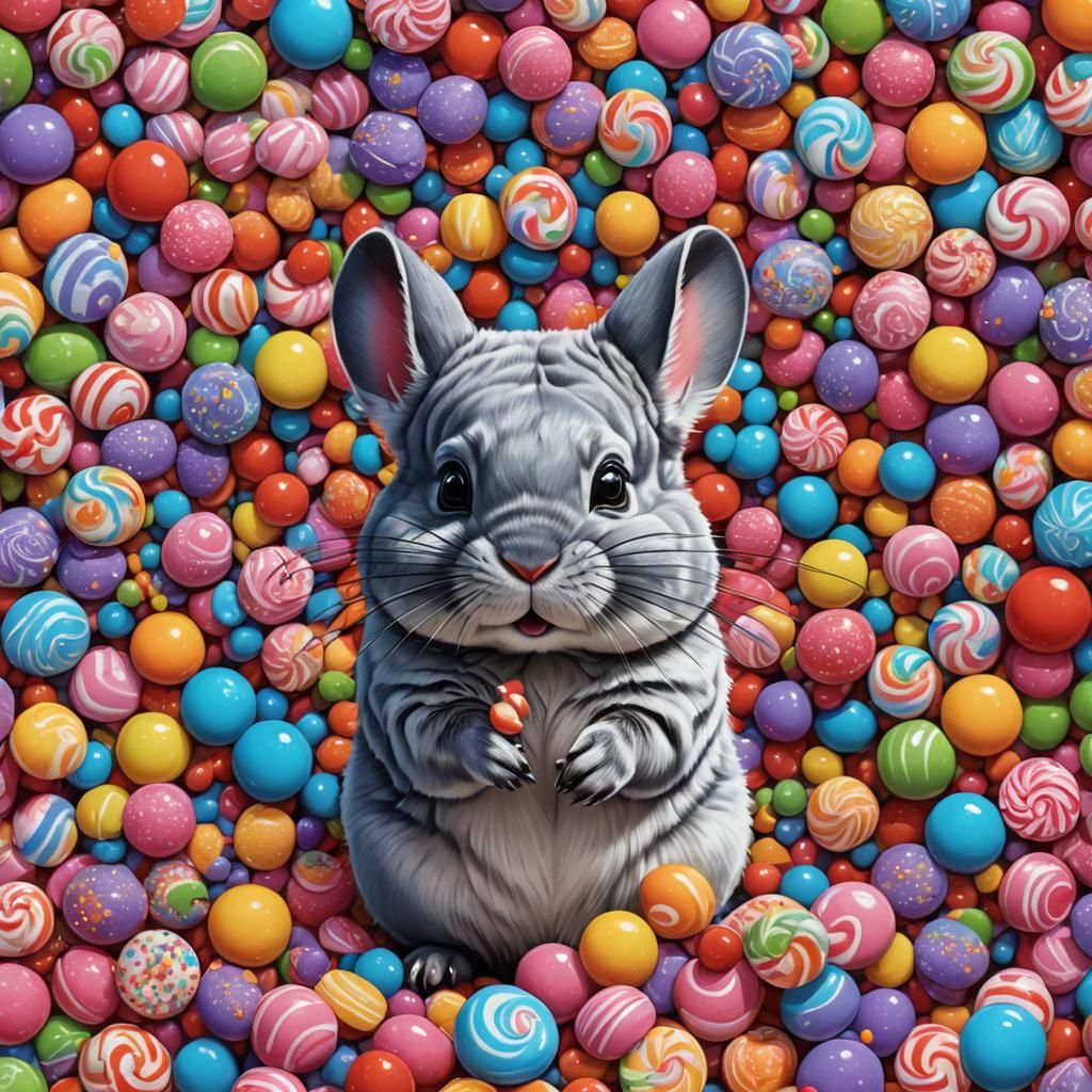 This image shows a chinchilla rendered in a whimsical, colorful candy art style. The digital illustration features hyperrealistic details and dynamic lighting, reminiscent of poster art.