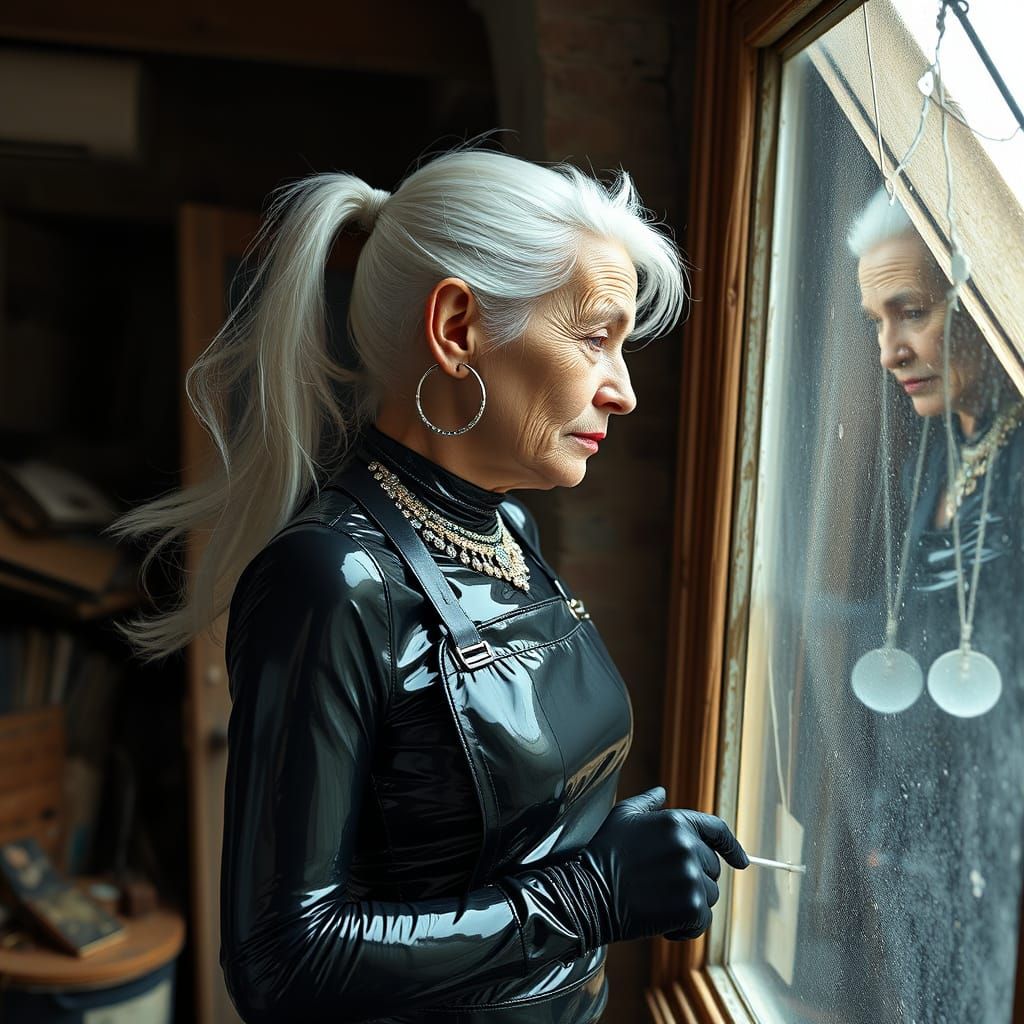 A striking picture of an older woman in a catsuit and apron cleaning windows in a dusty attic. The image is rendered with vibrant, hyper-detailed surrealism and neon lighting.