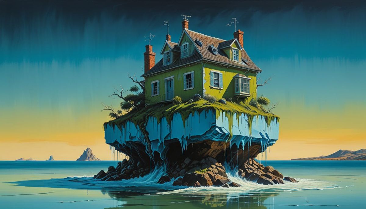 This image shows a cracked ceramic cup featuring a miniature coastal village. The village includes white buildings, green trees, and a serene sea with a small sailboat. Rendered with Studio Ghibli and Op Art inspirations.