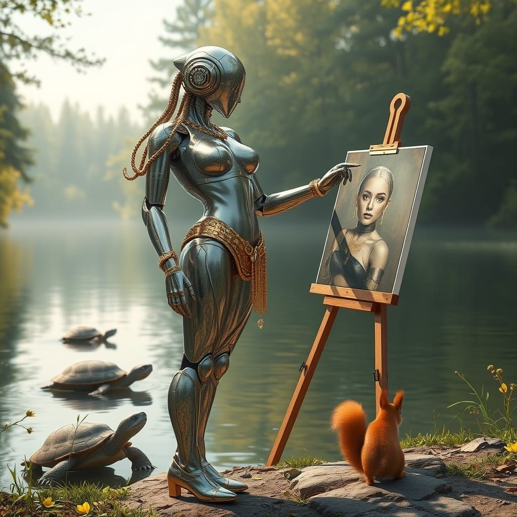 This image shows a stunning female robot in a serene forest setting, surrounded by nature and artistic expression, with intricate details and hyper-realistic lighting.