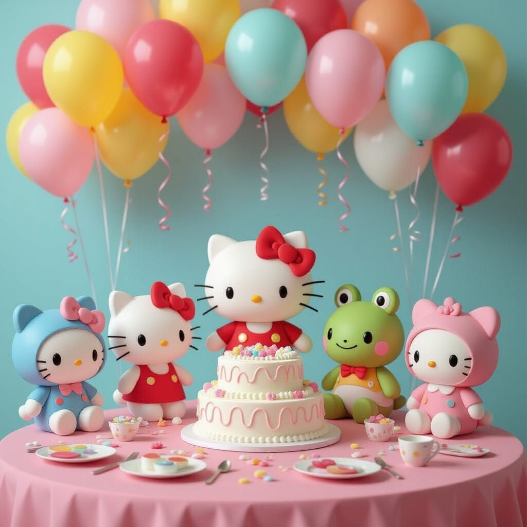 This image shows Hello Kitty, My Melody, and Keroppi at a party with balloons, streamers, and cake. The image is in a whimsical style.