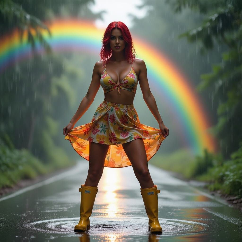 A stunning cinematic still of a woman dancing joyfully in summer rain, wearing a skirt, top, and shiny yellow knee-high boots. Features dramatic lighting and a vibrant rainbow.