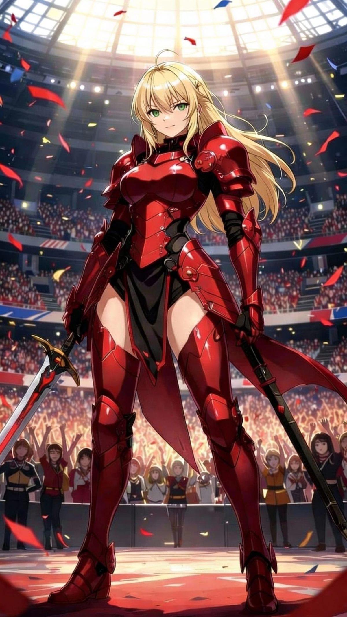 This image displays a blonde warrior in detailed red and black armor, standing in a lively stadium with a cheering crowd and streamers. The art is rendered in a painterly anime style with dramatic lighting.