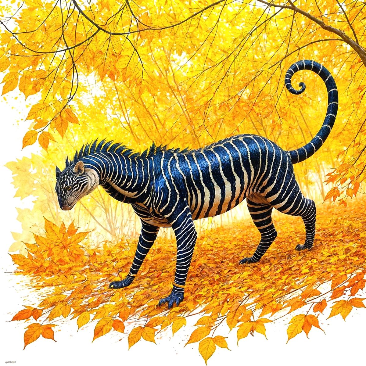 This image features a curious cobra emerging from vibrant yellow autumn leaves, rendered in a dynamic watercolor style with cinematic flair.