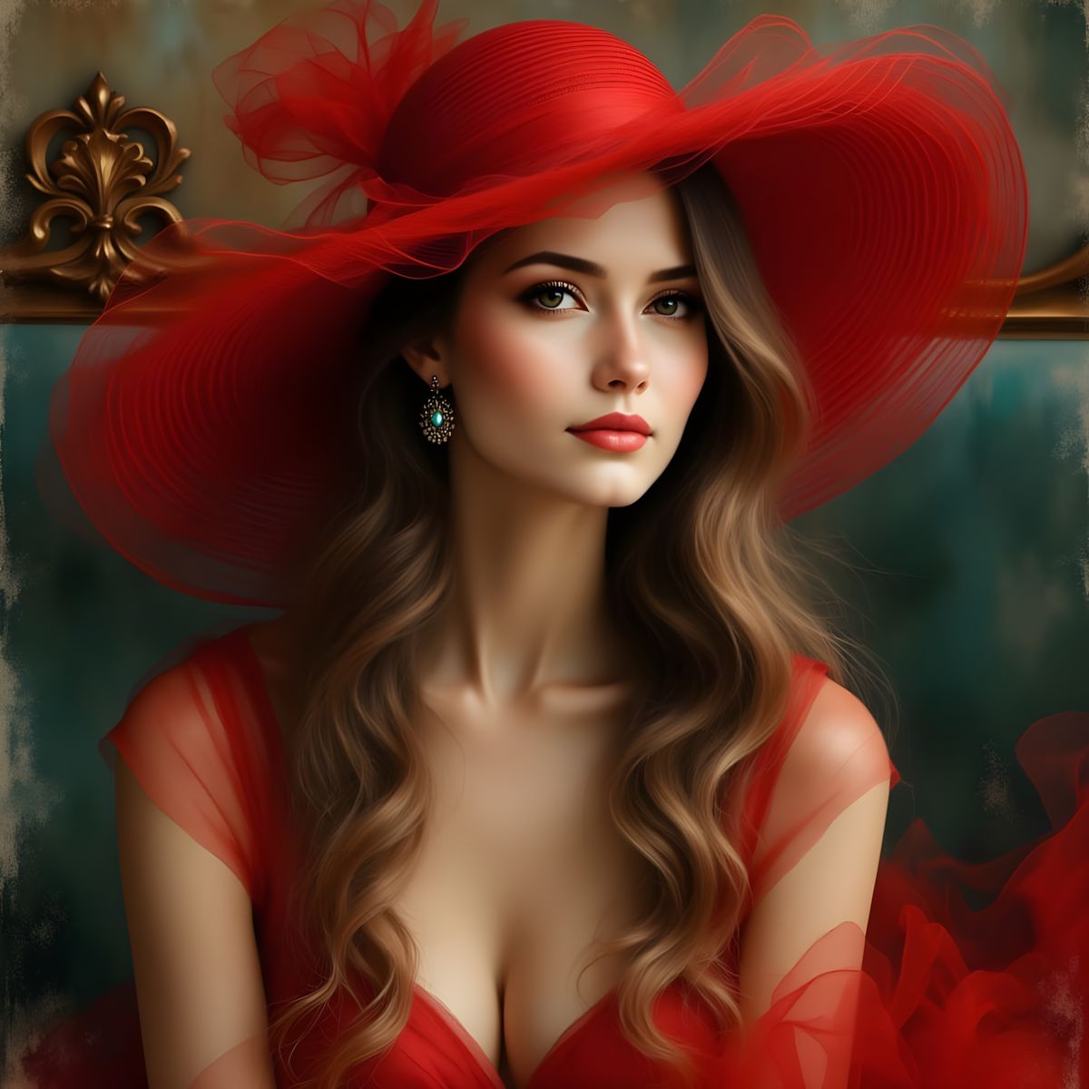 This image features a glamorous woman in a luxurious 1960s setting, wearing a striking crimson hat and delicate jewelry. Photorealistic fine art with masterful lighting.