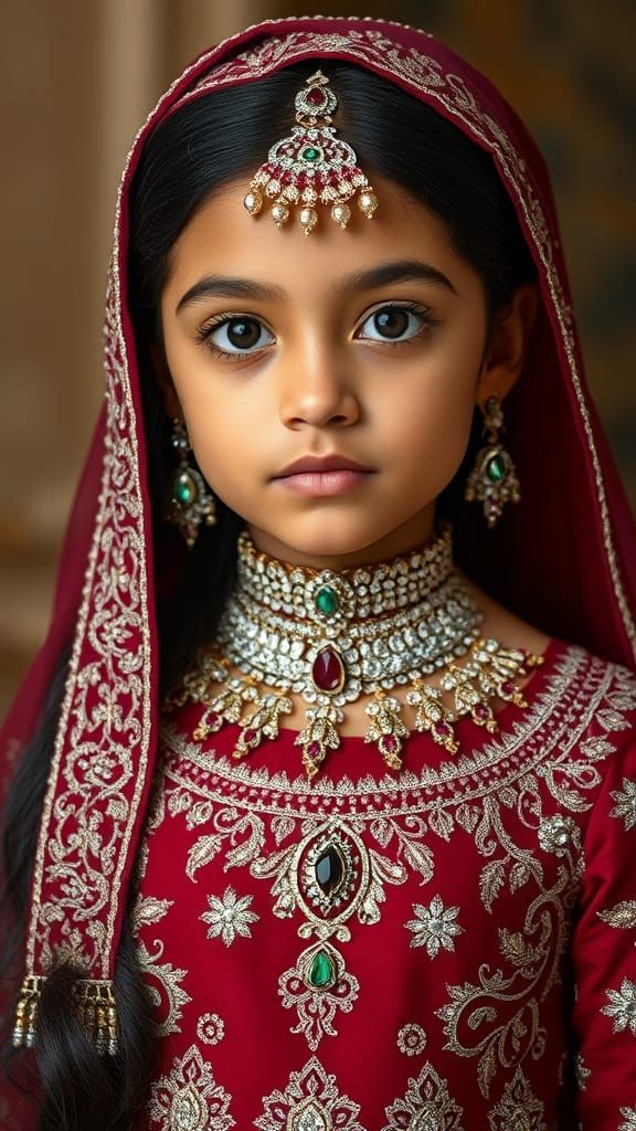 This image depicts a young girl wearing a stunning burgundy Eid dress adorned with crystal stones and silver beadwork, inspired by Indian and Middle Eastern haute couture. Her regal outfit is complemented by a bold Kundan choker, earrings, and maangtika, exuding luxury and poise.