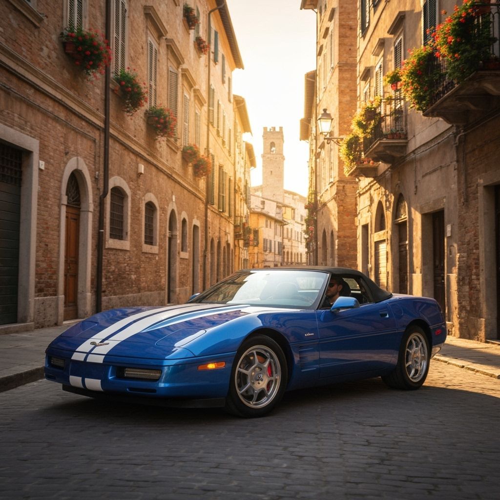 A deep blue luxury sports car roadster with white stripes cruises through a sunny, old Italian city near the sea. The vehicle blends Corvette and Ferrari styling from the 1990s.
