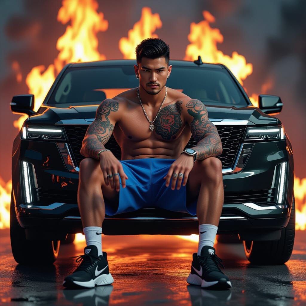 This image shows a shirtless man with tattoos calmly sitting in a burning Escalade. He wears Nike shorts and sneakers, illuminated by flames in a low-angle shot, as digital art.