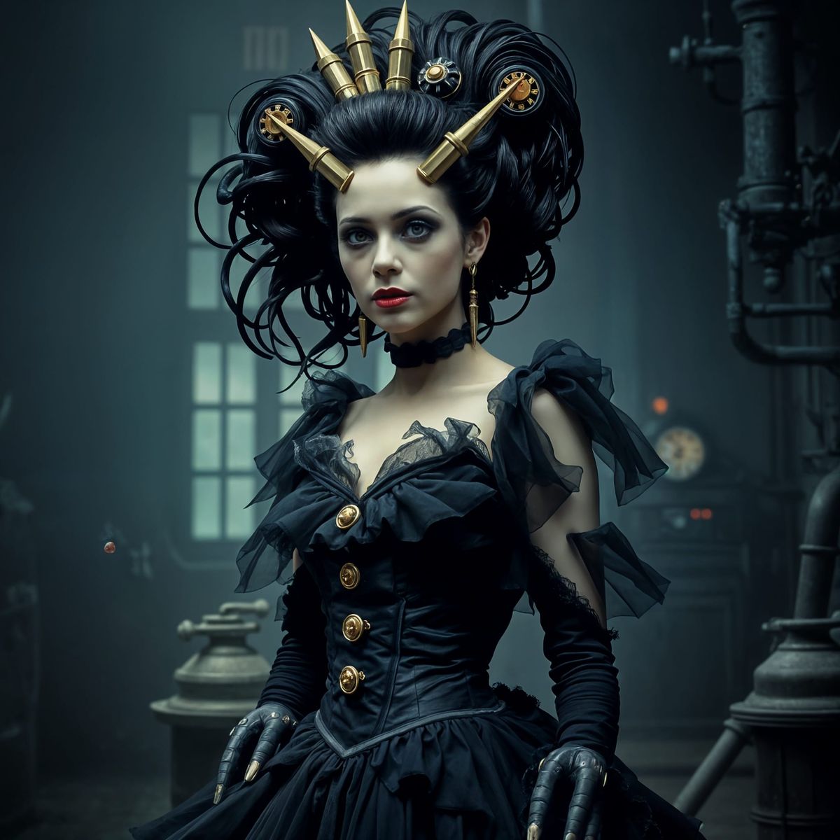 A dark and dramatic reimagining of the Bride of Frankenstein. This image blends Burton's gothic sensibilities with Giger's biomechanical artistry.
