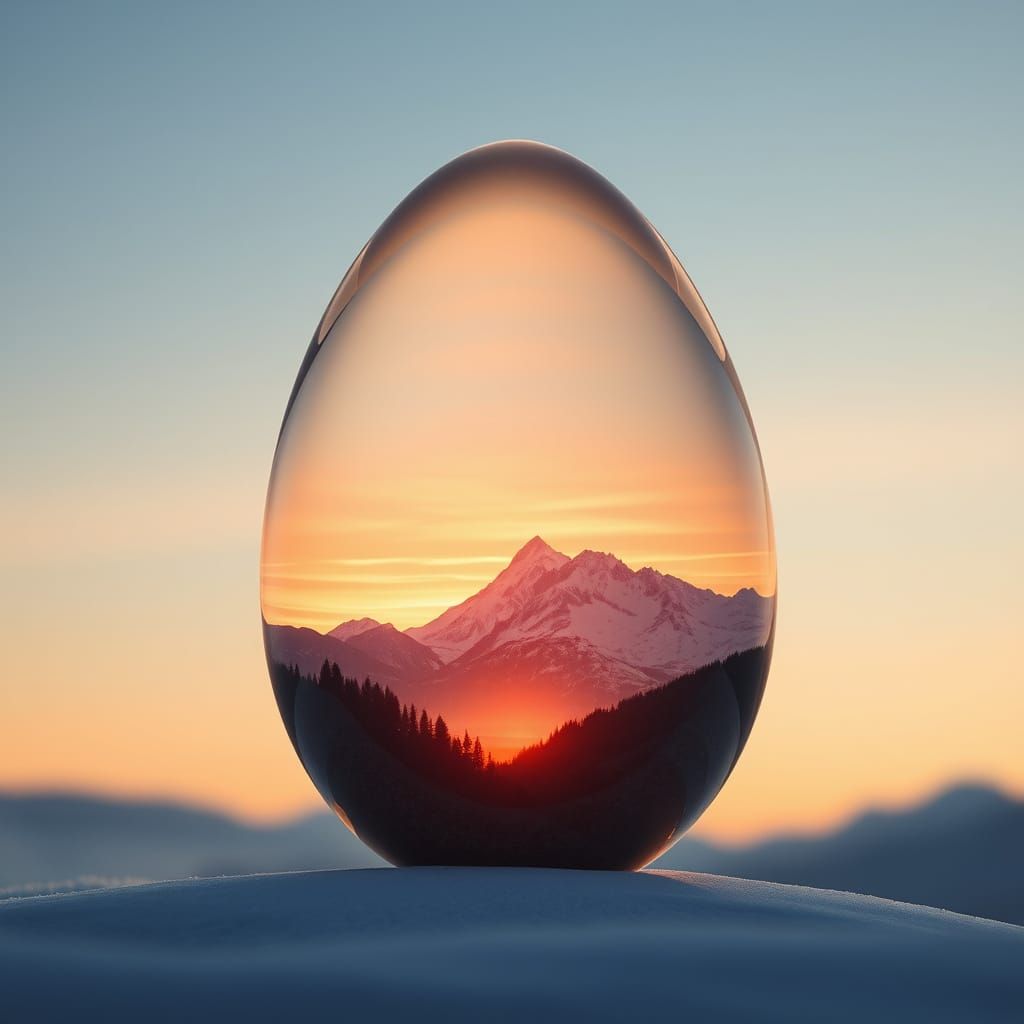 This image depicts a serene and majestic mountain landscape at sunset, set within a delicately crafted crystal egg. The scene is bathed in warm, golden light, with gentle mountains rising in the distance, covered in snow and lush green forests. The sky is painted with soft pastel hues of orange, pink, an...