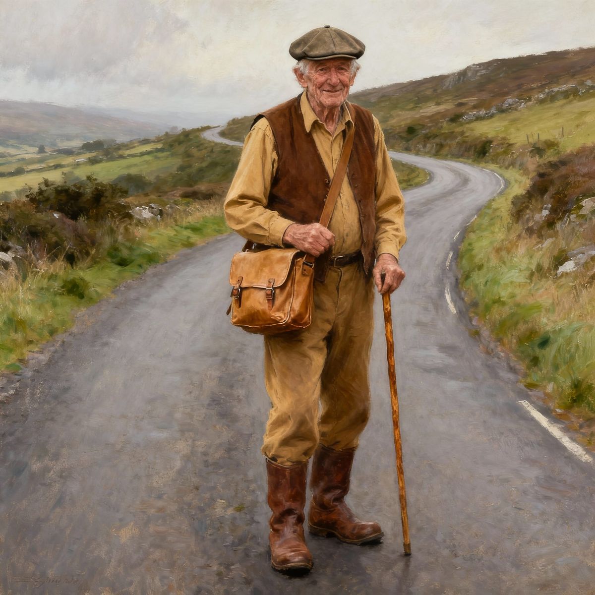 This image shows a weathered 70-year-old Irish man on a winding road, dressed in traditional attire and carrying a walking stick. Rendered in a realistic oil painting style with earthy tones.