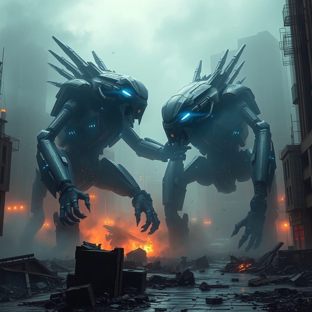 Mechanized behemoths clash amidst a ravaged, dystopian landscape, as titanic robots and advanced mechs, reminiscent of Syd Mead's and H.R. Giger's futuristic visions, wage war amidst the ruins of a once-great city, with atmospheric lighting and dense fog, evoking the gritty, industrial aesthetic of ...