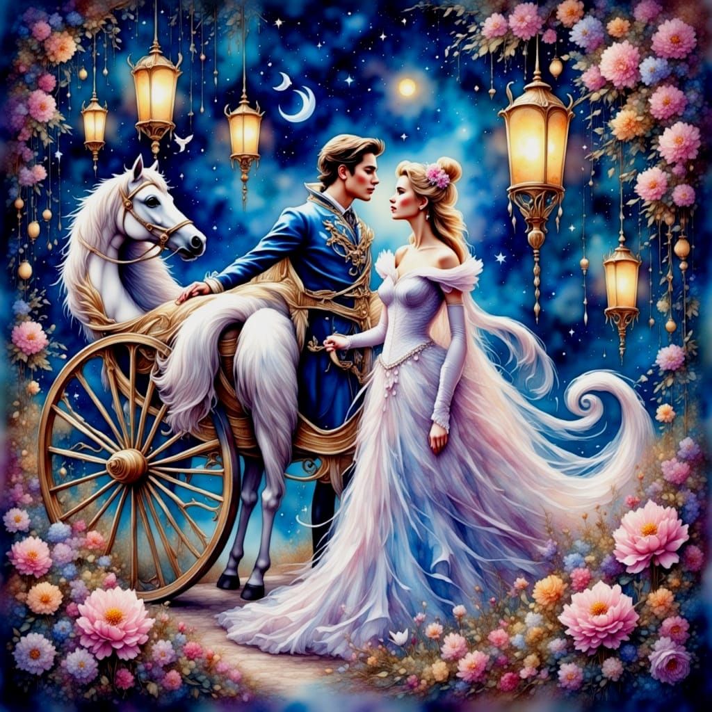 Cinderella and Prince Charming's wedding, a glittery carriage under a starry night sky, glowing lanterns floating in the air, soft pastel florals all around