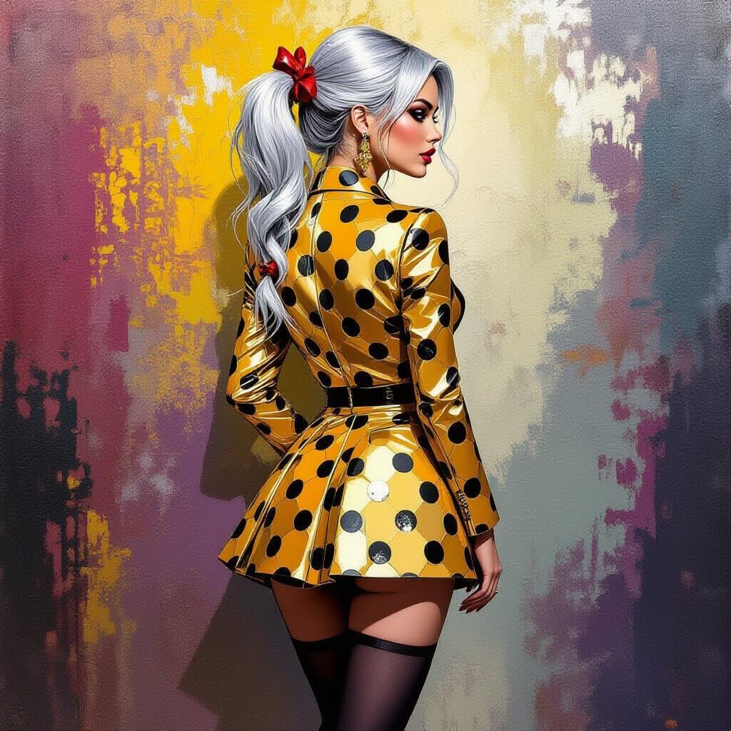 A striking portrait of a woman with silver pigtails in a gold polka dot suit. The image, reminiscent of tarot card art, uses impasto techniques and palette knife strokes.