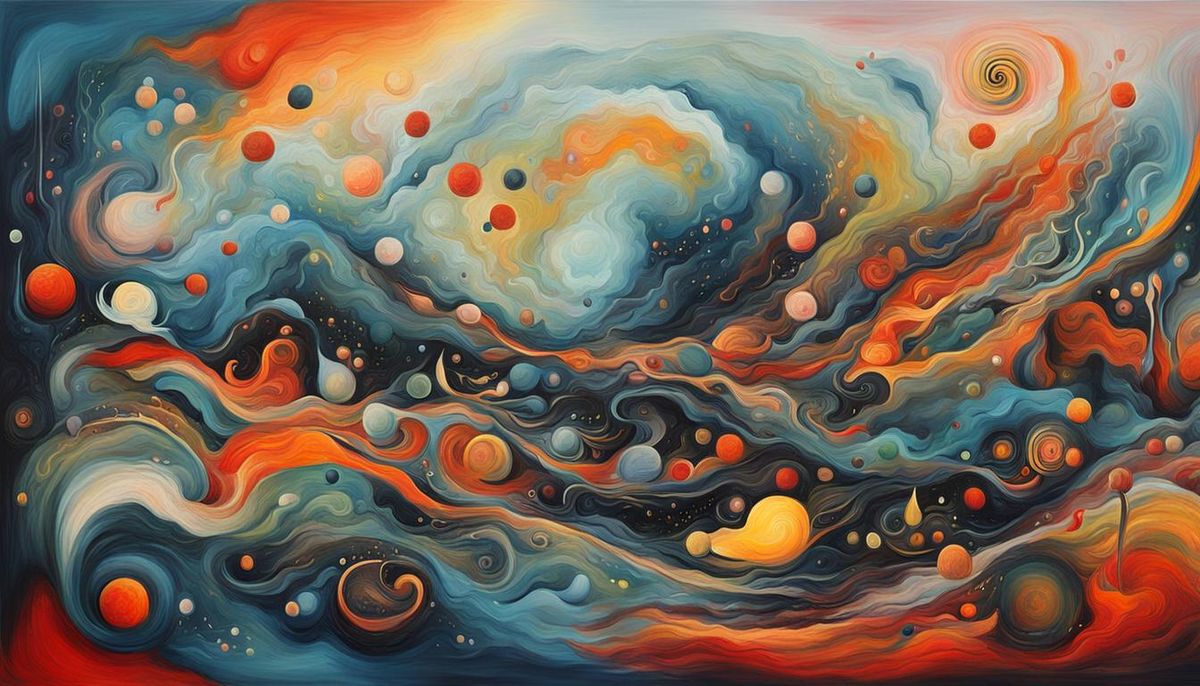 This image shows a surreal abstract painting with vibrant colors and unusual shapes. The artwork evokes a dreamlike atmosphere and invites viewers to interpret its meaning.