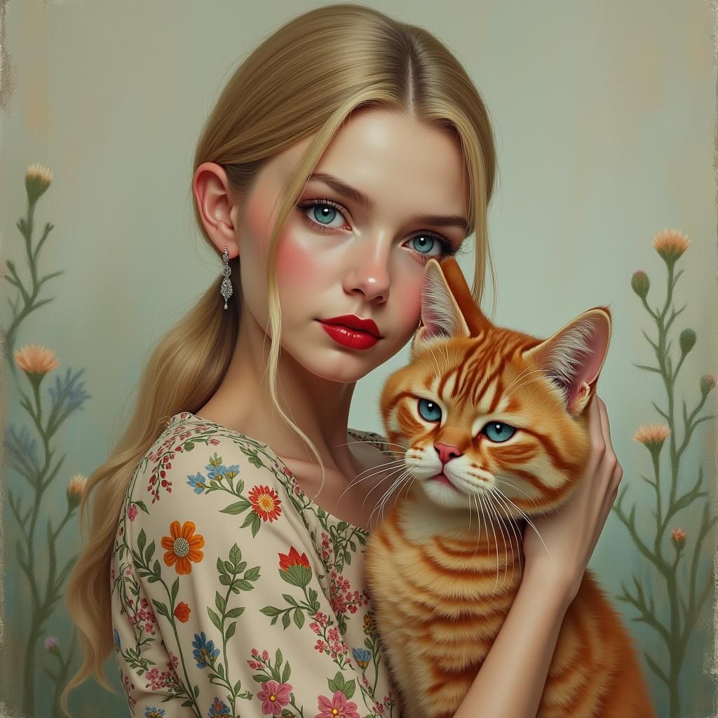This image depicts a blonde woman with blue eyes and red lipstick holding a brown Scottish Fold cat. It's a hyper-realistic matte painting with soft lighting and a pastoral background.