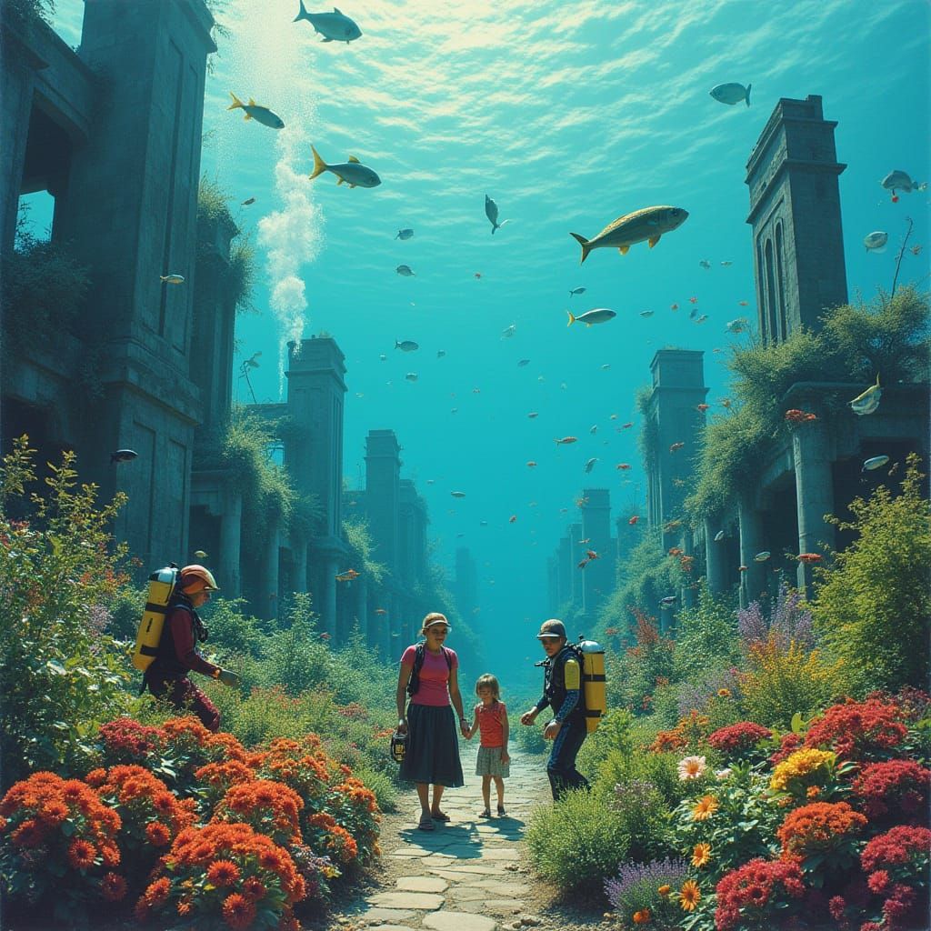 A vibrant underwater community garden thrives among industrial ruins, with residents in diving gear tending to plants. Children in scuba suits play amidst schools of fish in social realism.