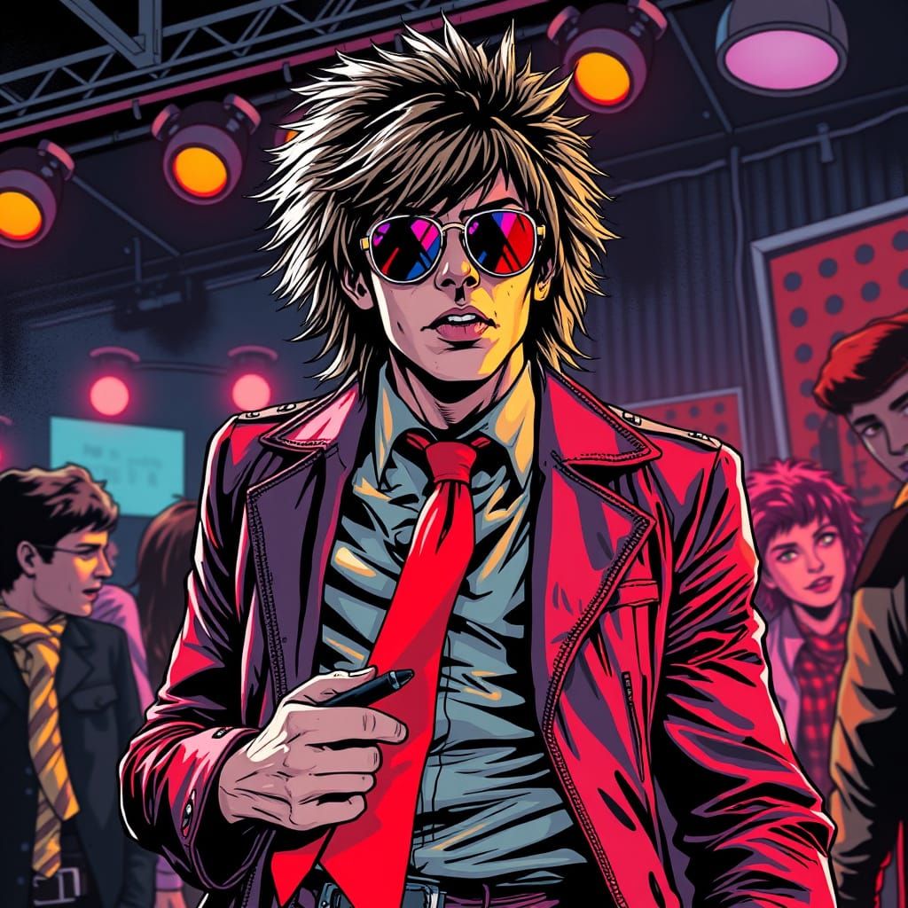 This image depicts a punk rock musician from the 1970s, embodying the Galaxy Emperor, complete with a red tie. Rendered in a gritty graphic novel style with bold lines and high contrast, it captures the rebellious spirit of punk art.