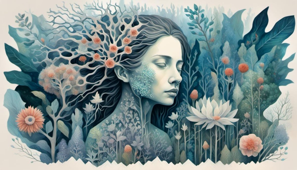 A mixed media artwork displaying an abstract female figure experiencing pain, set against a backdrop of nature and diverse emotional expressions. This evocative image captures a feeling of melancholy.