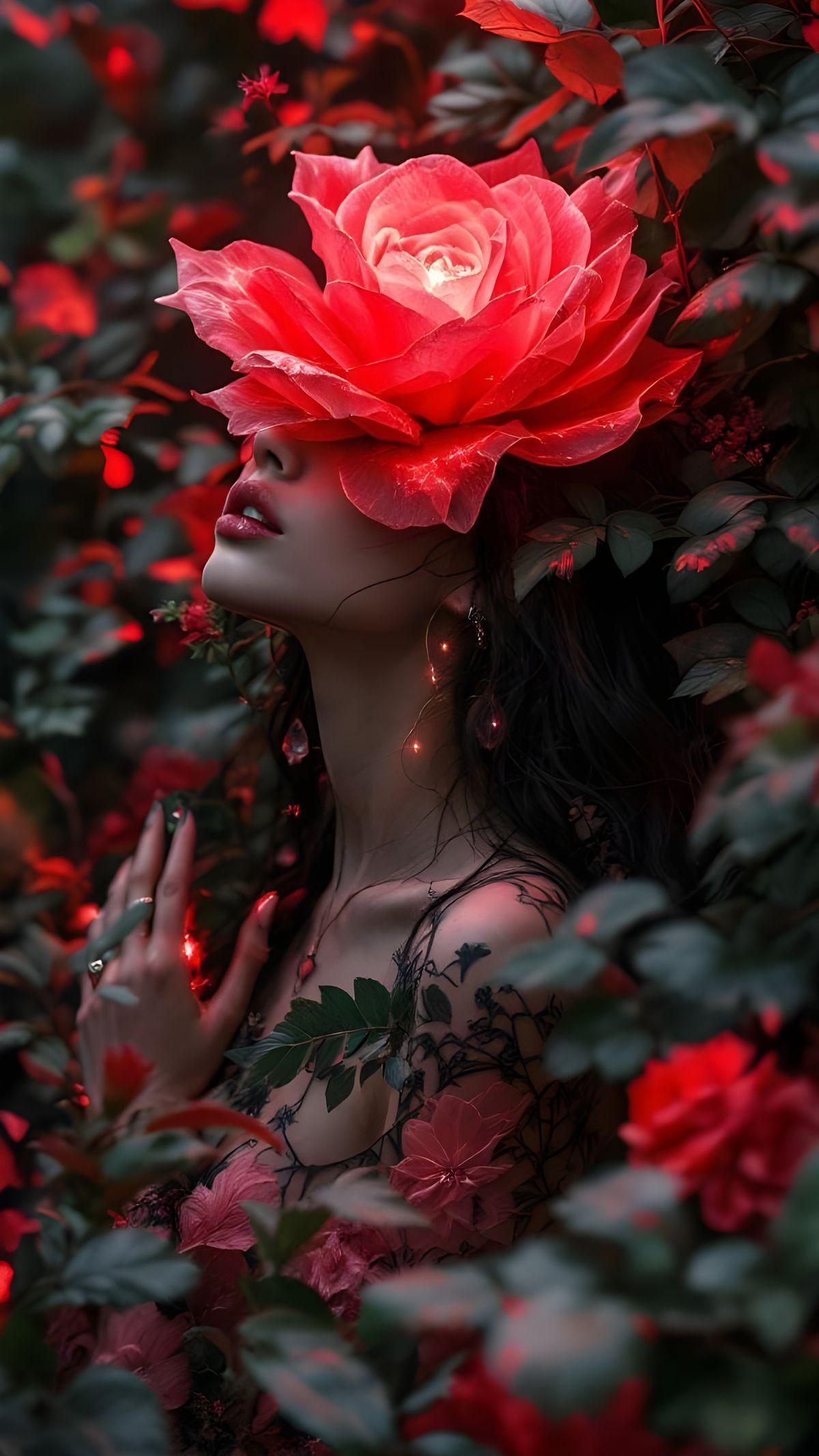 This image shows a fusion of a female form and a red rose, with glowing bioluminescent elements. The artwork is a detailed digital painting with a mystical and dramatic atmosphere.