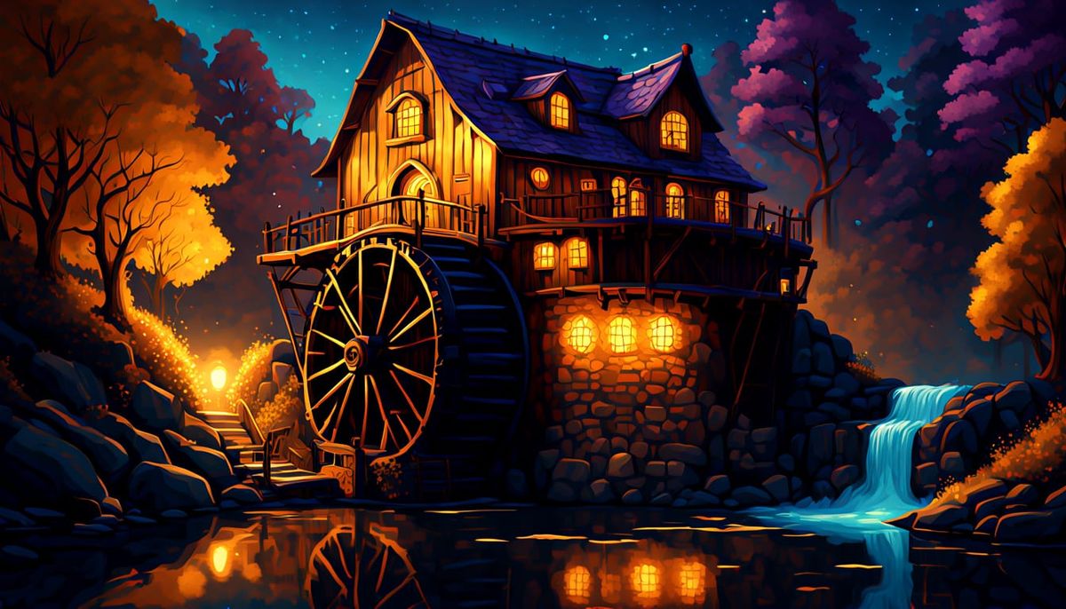 Easily design your own bioluminescent river images with our free AI image generator, featuring glowing lights, historic waterwheels, and more.