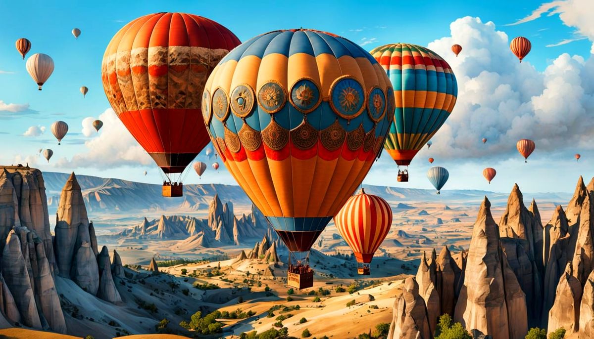 A vibrant image shows steampunk hot air balloons floating over Cappadocia's rocky landscape. The artwork features intricate details, vibrant colors, dramatic lighting, and smooth textures, as a watercolor and alcohol ink painting.