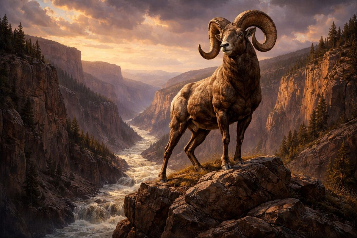 This dramatic painting captures a majestic full curl bighorn sheep ram on a cliff edge, overlooking a vast western river canyon with a cascading river below.