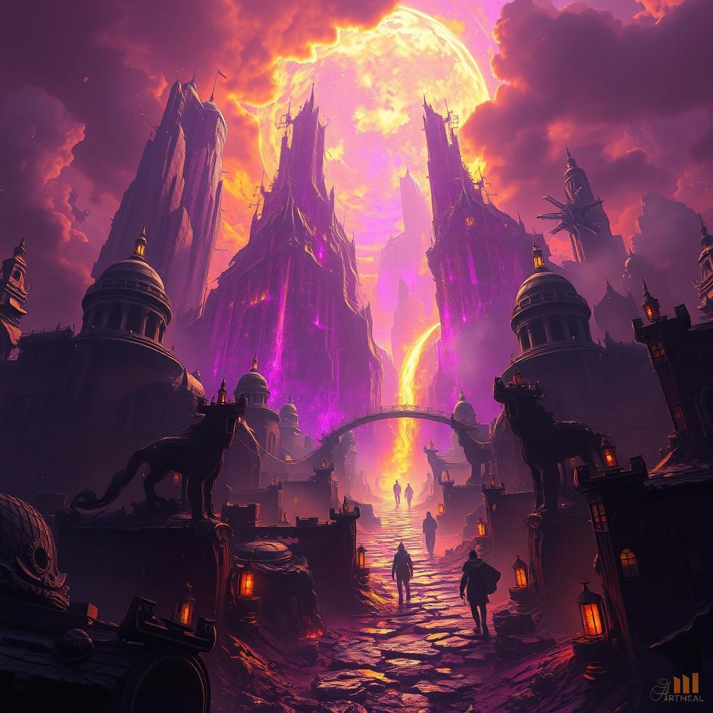 A stunning dark fantasy concept art piece in 8k resolution. Hyperdetailed with dynamic and volumetric lighting, the image features purple and yellow complementary colors. A splash screen art.